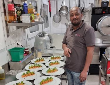 I am Daniel Tesfay and I come from Eritrea. I have been working here in the kitchen since 2020. At first, I worked mainly in the office, but the longer I work here, the more you'll find me in the position of the gardemanger. I like it very much and I am proud to prepare beautiful plates for you, dear guests.
